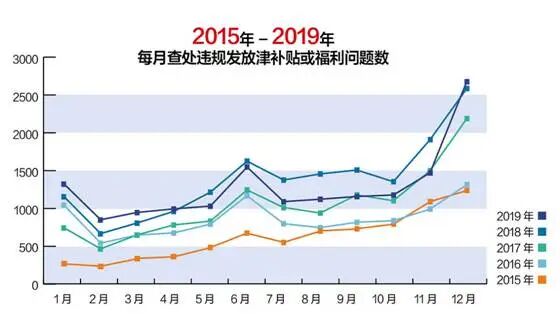 元旦春节、五一端午、中秋国庆等节点,是违规发放津补贴或福利问题的高发期。自2015年1月全国查处违反中央八项规定精神月报加入“违规发放津补贴或福利”这一项后,此类问题在违反中央八项规定精神问题中占比一直居高不下,每年的12月至次年1月、5月至6月、10月至11月,查处的此类问题数多出现小高峰。